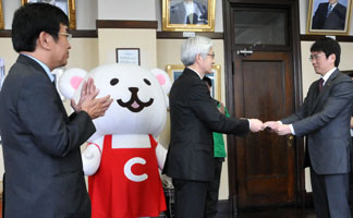 その贈呈式が、3月7日(火)9:00から市役所(花園2)2階市長応接室で開かれ、同社・中島則裕専務理事、同社宅配事業本部・新谷康司札幌西地区地区長、同岩本啓祐小樽センター長と、ナップランドを背負った同宅配システムイメージキャラクター「トドック」が出席、生活環境部生活安全課職員が対応した。