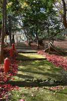 コケが生えた石段脇には、赤い絨毯が敷かれている。