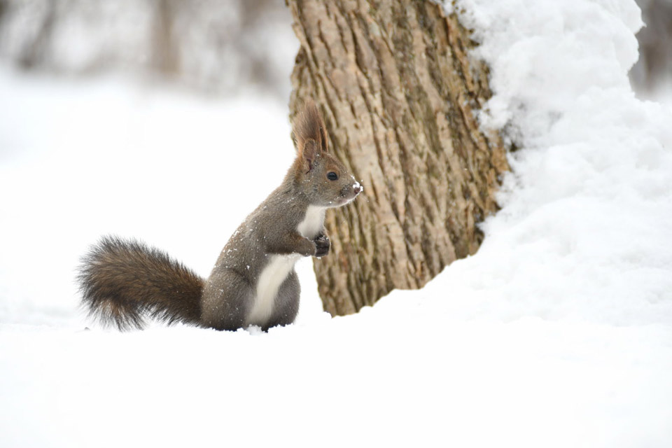 大好物の胡桃を小さな手で持ちカリカリと音を立てて食べたり、雪の中や木の枝分かれした部分に胡桃を隠したり、隠した胡桃を掘り起こしたり、忙しく動き回る。