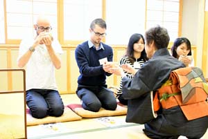 茶道では、前田代表が茶のお点前を披露した後、スタッフ9名によるお点前のお茶を、袱紗(ふくさ)の使い方やお茶のいただき方の説明を聞いた後、芋羊羹とともに味わった。