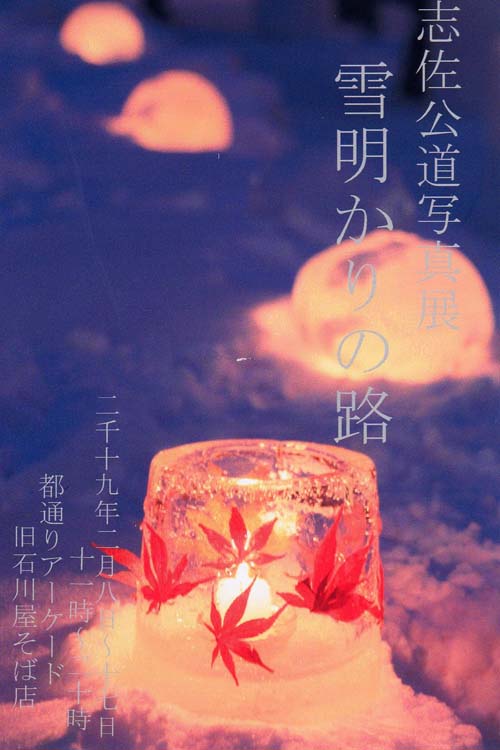 旧石川屋を休み処として11:00~20:00に開放。温かい飲み物を用意し、小樽の写真家・志佐公道さんの雪あかりの路写真展を開催中。小樽雪あかりの路メーン会場の運河や朝里川温泉・塩谷などで、ブルーアワー時を狙って撮影した20枚を展示。