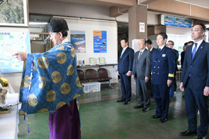 水天宮(相生町3)の大小島平和宮司による海上安全の祝詞が上げられ、同社・明井代表取締役をはじめ、来賓・関係者38名が出席。小島萌子船長らが玉串を捧げ、今シーズンの安全運航を祈願し、甲地一嗣船長が代表して同宮司から安全祈願の札を受け取った。