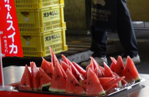 初せりに先立ち、黒崎理事は、「今年も立派ならいでんすいかとなり、実がついてからの天候が良く、味・食感・糖度共に、満足のいくものができた。今シーズンも最後の一玉まで、小樽の皆さんい美味しいと言っていただけるよう、頑張って出荷します」と挨拶した。 市場関係者に初物のすいかが振舞われ、「甘い」の声が飛び交った。