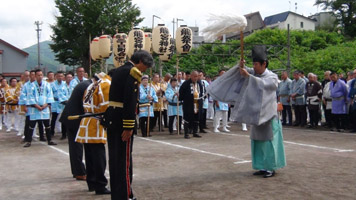 15:00から、龍宮神社例大祭宮出しの儀が行われ、同神社の本間公祐宮司、小樽稲荷神社の中谷禰宜(ねぎ)により、神事が執り行われ、神輿の安全と祭りの成功を祈願した。同神社・中ノ目孝道祭典委員長、榎本隆一郎氏、小樽北海睦会関代表、小樽龍祭會井上廣会長らが、玉串奉奠を行った。 提灯行列を先頭に、本間宮司、榎本武揚に扮する中ノ目氏ら、神輿が続き、威勢の良い掛け声を響かせ、階段を降りて町へ繰り出した。