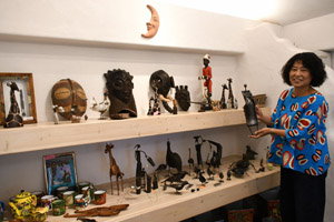 今回は、高橋代表所蔵の未公開作品も多く持ち込まれ、サイやヒョウ、ゾウなどアフリカを代表する大きな動物(ビック5)を石で作って並べた額、10年前から所蔵するコンゴの工芸品・草で編んだタペストリー、木で作ったマスクなど約2,000点を展示販売している。