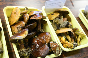 身近な山々には多種類のキノコが生息。最低気温15℃を下回る頃になるとキノコが出るサインで、昨年に比べ、ハナイグチ(ラクヨウ)は豊作。雨も降り多くの種類のキノコが集まったという。