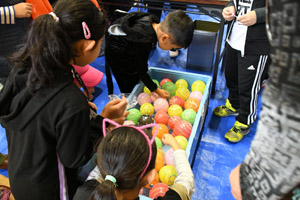 各学年のPTAが担当する6つのゲーム、ペットボトル10本を倒す「ボーリング」・水槽の中のカップにコインを入れる「コインゲーム」・5回チャンスの「わなげ」や玉入れの玉を使ったハロウィン仕様の「まとあて」・2チームで対戦し自分の色に変える「オセロ」は全て手作り。会場は、大勢の人で溢れ、熱気に包まれた。