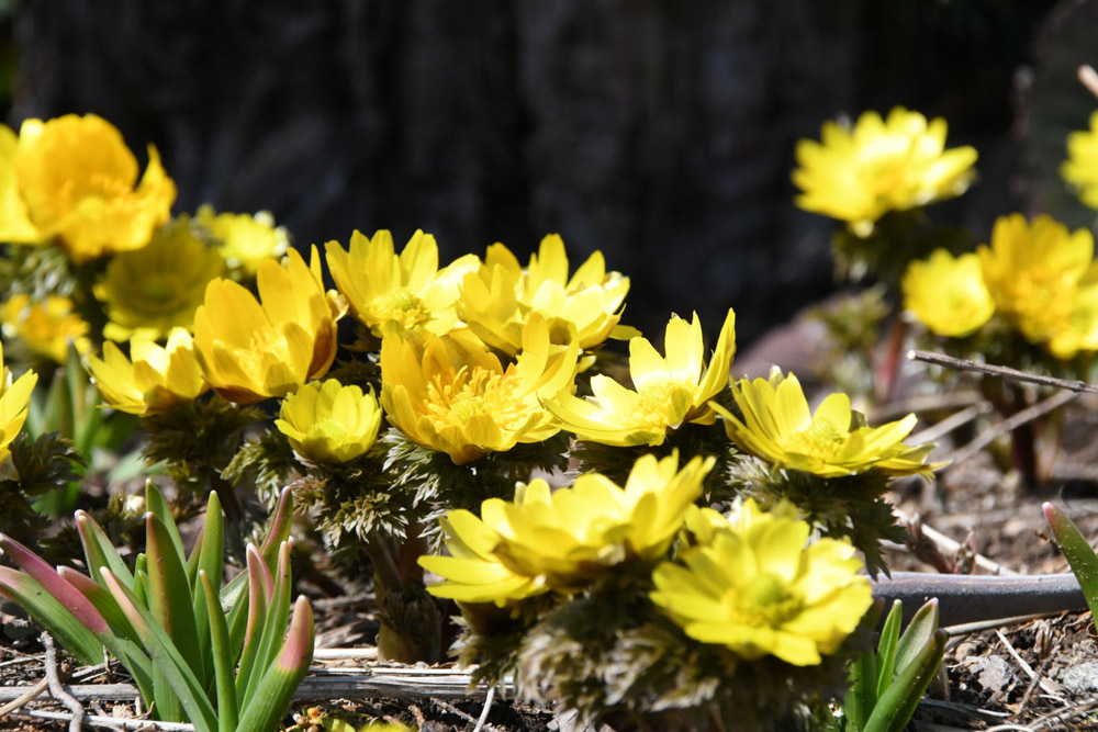 雪解けとともに、ここ1週間で咲き始め、春の妖精(スプリング・エフェメラル)とも呼ばれる福寿草が群生となって、春の到来を一番に告げている。花言葉は、“永久の幸福”や“幸福を招く”で縁起の良い花だ。