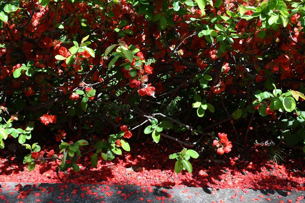 満開を過ぎたボケの垣根には、地面に落ちた花びらが敷き詰められ、真っ赤な絨毯ができていた。