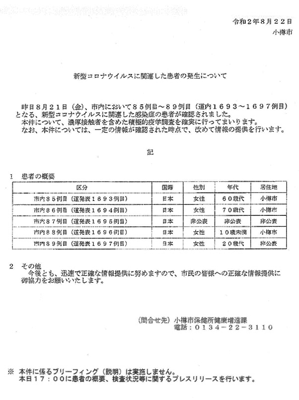 小樽市内コロナ感染者 さらに5名増加! 2020/8/22 市政・市議会, 注目記事, 社会・経済 シェアする LINE! 小樽市(迫俊哉市長)は、8月21日(金)に、市内85例目〜89例目(道内1693例目〜1697例目)の新型コロナウイルス感染症陽性者5名が、新たに確認されたと、22日(土)15:02に発表。 詳細は、本日17:00にプレスリリースが行われる予定。 ◎関連記事 関連記事 アスベストを学ぼう!市民学習会開く!