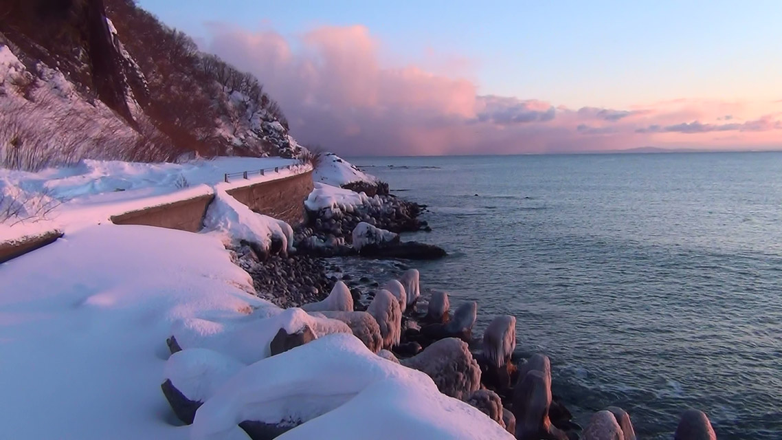朝7:16に最低気温−9.3℃を観測。高島岸壁から石狩湾が見渡せ、水平線付近に厚い雲もなく、ピンク色に染まる朝焼けと空には細い月も見え、絶好の日の出日和となった。
