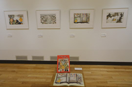チラシにも使用された1982(昭和57)年「冬の坂道」など手宮市場周辺をモチーフにした心和ませる連作、銅版画作品50点を多目的ギャラリーに、出版した絵本「ふゆのいちばへおかいもの」(福音館書店)を含む7冊から原画などを紹介した市民ギャラリー1、北海タイムスや北海道新聞などの新聞、小説・児童書・同人誌の挿絵などの原画、外国での個展開催時の現地新聞記事など含めた市民ギャラリー2に展示。
