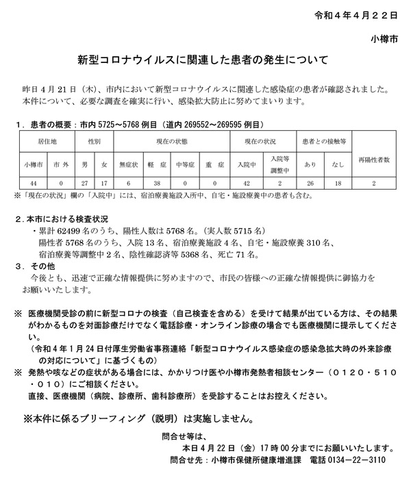 小樽市(迫俊哉市長)は、4月21日(木)に、市内5,725〜5,768例目(道内269,552〜269,595例目)となる新型コロナウイルスに感染した患者44名を確認したと、22日(金)15:00に発表。新たに再陽性者を2名確認し、これまでを合わせ53名に。
