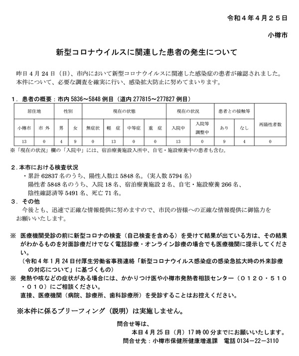 小樽市(迫俊哉市長)は、4月24日(日)に、市内5,836〜5,848例目(道内277,815〜277,827例目)となる新型コロナウイルスに感染した患者13名を確認したと、25日(月)15:00に発表。再陽性者はいない。