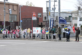 その後、国道5号線沿いで、ロシアのウクライナ侵攻に抗議するスタンディングを行い、戦争反対やロシアはウクライナ撤退などと書かれた旗やプラカードを手に、ドライバーや道行く人々に平和を呼び掛けた。