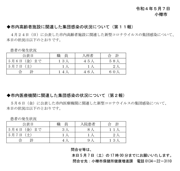 小樽市(迫俊哉市長)は、5月6日(金)に、市内6,378〜6,446例目(道内304,551〜304,620例目)となる新型コロナウイルスに感染した患者70名を確認したと7日(土)15:00に発表。新たに再陽性者を1名確認し、これまでを合わせ59名に。