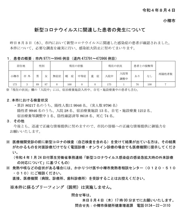 小樽市(迫俊哉市長)は、8月3日(水)に、市内9,771〜9,946例目(道内473,791〜473,966例目)となる新型コロナウイルスに感染した患者176名(市外3名)を確認したと、4日(木)15:00に発表。新たに再陽性者を7名確認し、これまでを合わせ150名に。7月28日(木)の175名を超える過去最多となった。