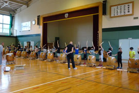 小樽市立高島小学校(高島5・篠崎大作校長)では、総合的な学習時間において地域の伝統や文化について学び、体験的な活動を通し、児童の学習への理解を深めることを目的として、9月5日(月)10:45から11:30まで同校体育館で、3年生(27名・特別支援学級児童含む)が、おたる潮太鼓保存会(大黒博代表)から太鼓演奏を学んだ。