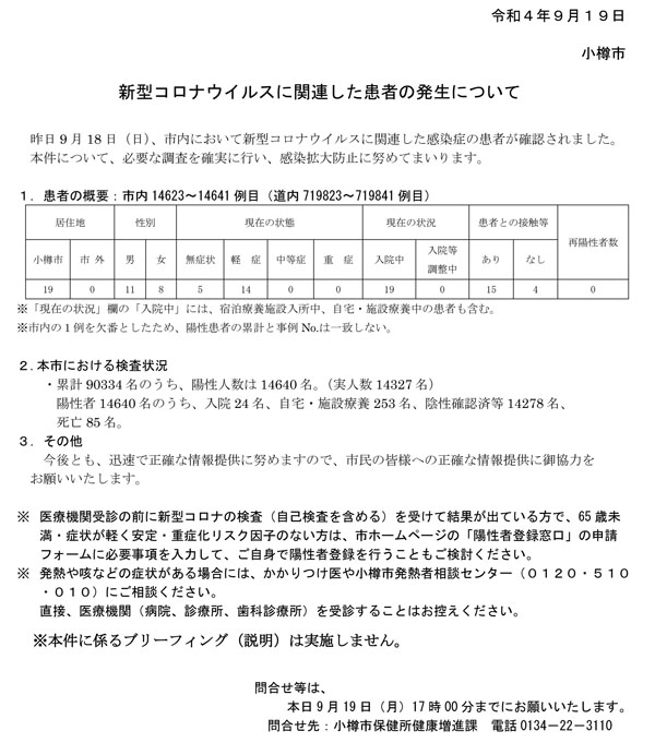 小樽市(迫俊哉市長)は、9月18日(日)に、市内14,623〜14,641例目(道内719,823〜71,841例目)となる新型コロナウイルスに感染した患者19名を確認したと、19日(月)15:00に発表。再陽性者はいない。