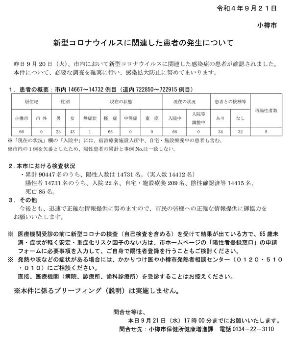 小樽市(迫俊哉市長)は、9月20日(火)に、市内14,667〜14,732例目(道内722,850〜72,2915例目)となる新型コロナウイルスに感染した患者66名を確認したと、21日(水)15:00に発表。新たに再陽性者を5名確認し、これまでを合わせ319名に。