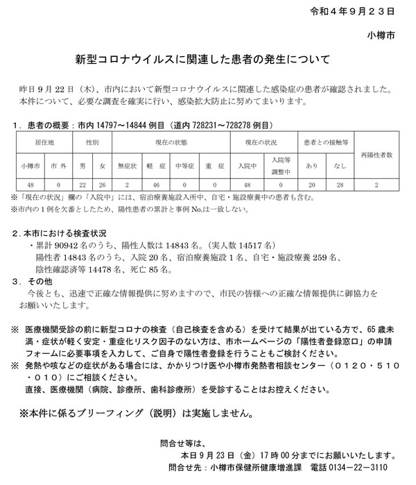 小樽市(迫俊哉市長)は、9月22日(木)に、市内14,797〜14,844例目(道内728,231〜728,278例目)となる新型コロナウイルスに感染した患者48名を確認したと、23日(金)15:00に発表。新たに再陽性者を2名確認し、これまでを合わせ326名に。