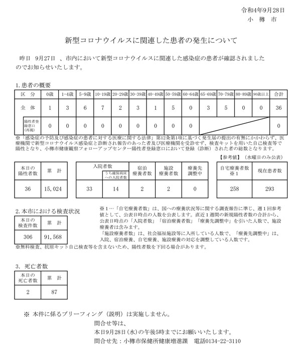 小樽市(迫俊哉市長)では、医療機関で診断し報告のあった者、及び検査キット等で陽性となって陽性者登録センターに登録された者を合わせた新型コロナウイルス感染の新規陽性者36名を、9月28日(水)15:00に発表。再陽性者の公表はない。