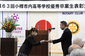 小樽南ロータリークラブ(山村弘一会長)では、2月4日(土)11:00から小樽経済センタービル(稲穂2)7階ホールで、青少年の健全なる育成に関する事業・第63回小樽市内高校優秀卒業生表彰式を開催した。
