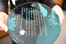 表彰者紹介後、大正硝子制作の硝子の盾の表彰状を贈った山村会長は、「受賞者の皆さんは、これからの人生を希望と誇りを持って生活してください。我々ロータリアンの胸に基づく立派な行動・人格の形成・職業において道徳的水準を高め、社会に奉仕し立派な人間になることを心から願う」と祝辞を述べた。