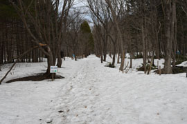 最高気温は14:11で14.2℃、積雪は19cm(15:00)だが、同公園の散策路はまだ雪深く、多いところで80cmほどの積雪があり、スノーシューで散策している人もいるほど長靴の用意が必要だ。