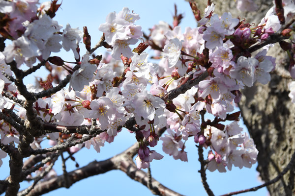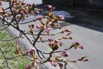 小樽には開花宣言する標本木はなく、雪やみぞれが降り寒い1日となった17日(月)は、桜の開花も足踏みしていたが、18日(火)は朝から晴れ渡り、最低気温は昨日同様の1.2℃と4月上旬並みで、13:28には最高気温は14.5℃まで上昇し、桜の開花を後押しした。あちらこちらで開花が見られ、桜前線が到着したようだ。