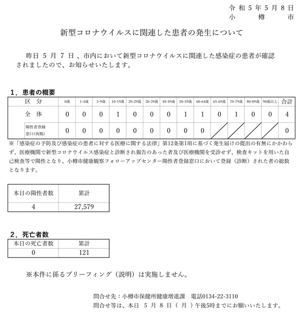 小樽市(迫俊哉市長)では、医療機関で診断し報告のあった者、及び検査キット等で陽性となって陽性者登録センターに登録された0名を合わせた新型コロナウイルス感染の新規陽性者4名を、5月8日(月)15:00に発表。