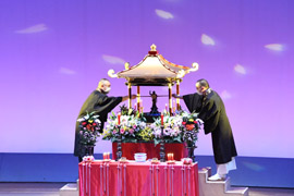 昼の部・子ども花まつりは、市内の仏教関連の幼稚園・保育園園児400名が参加。ステージ上に祭壇を設けて、1部は灌佛法要が行われ、同会副会長と小樽双葉高校の生徒の協力で、御灯・御花・御香・甘茶を捧げた。