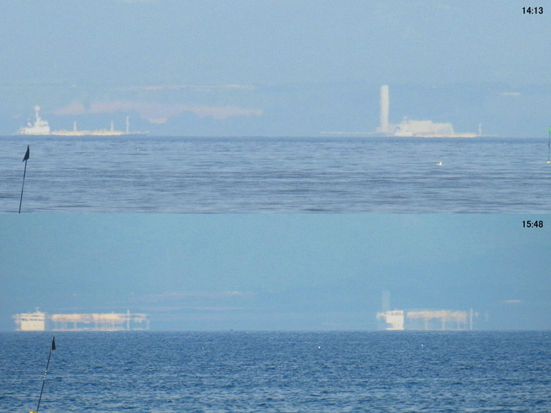 今回、特に注目するのは15時35分過ぎから北石狩衛生センター手前に見える停泊中貨物船2隻が反転像を伴った変化かもしれない。操舵室や船舶側面が伸び上がるのはよく見かけるが、反転像を伴う瞬間をとらえたのは珍しいでしょう。( 北石狩衛生センターと船舶蜃気楼)