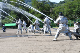 指揮者以下4名1組で行う小型ポンプ操法訓練に参加した団員は、迅速な行動でホースを担いで走ったり、使い終わったホースを元通りに巻直したり、大変な作業にもめげず、全力で走り行動していた。
