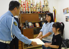 9月20日(金)に同校で、竹内署長・武田健志交通課長・稲垣廣次小樽地域交通安全活動推進委員らが出席して贈呈式を行い、5年生代表の長谷川さん(11)と3年生代表の浅野さん(8)に、竹内署長から感謝状が贈られ、稲垣推進委員からは記念品が贈られた。