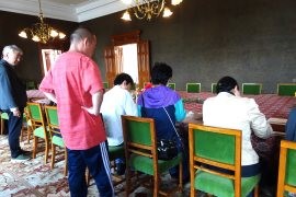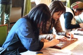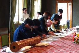 ワークショップ参加者は、出来上がった作品をを持って貴賓室へ行き、使われている同じ模様の金唐革紙と照らし合わせて感動していた。
