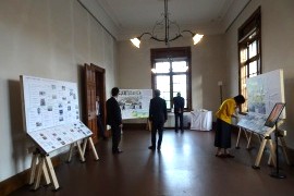同所2階書籍室と食堂では、これまでのあゆみ等のパネル展を開催。同所初の自社事務所として明治40年に建てられた旧小樽商業会議所事務所(縮尺1/60)を模型で再現。事務所移転の歴史も地図で紹介している。