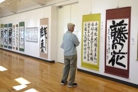 初日当番の書道市展委員の女性は、「社中の方で近代詩文に挑戦され、これまでにない傾向の作品に取り組まれていた。市展賞受賞の岩淵さんは、線が鍛えられていて練習の成果が見えとても素晴らしい。市長賞の岩城さんは90歳以上の方で、とても良く書けていると思う」と話した。