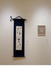 初日当番の一條翠苑さんは、草書と楷書で書いた「燈」の2作品と、「群青」を青帯に裏打ちして帯留めを付けたお洒落な作品に仕上げている。