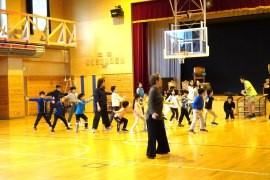 「上手く踊ることではなく、恥ずかしがらずに積極的に、楽しい音楽を聴いて1人で踊ったり、大勢の仲間や友だちと踊ったり、いろいろな人と関わりながら、それぞれが創意工夫して踊る楽しみを体験する」とし、NHKの朝ドラからヒントを得て、やなせたかしの名言「何のために生れて、何をしながらいきるのか」「絶望のとなりは希望や人生をよろこばせごっこ」などをテーマに、アンパンマンのマーチ(サンバ)・勇気凛々(チャチャチャ)・サンサンたいそう(サルサ)・アンパンマンたいそう(ジャイブ)・勇気100%(リズム体操)を、全生徒がひとつになり、感動をいろいろなダンス動作で身体表現した。 小林塾長は、「大きな夢を持ってと、メッセージソングでもあるアンパンマンの音楽を通じて、いろいろなダンスの動作を表現してもらい、サンバ・チャチャチャ・サルサ・ジャイブ・リズム体操の拍と拍子と、それぞれの動作の特色を表現してほしい」と話した。