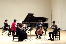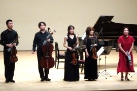 2曲目は、中川氏と市川氏に、さらに飯村真理氏のヴァイオリン・青木晃一氏のヴィオラ・猿渡輔氏のチェロが加わり、シューマンの「ピアノ五重奏曲変ホ長調作品44」を演奏。第4楽章に分かれそれぞれに特徴があり、力強い演奏でフィナーレを迎えた。
