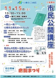 市民公開講座は2階講堂で13:30~15:00。1部は今年3月に発行したガイドブックを制作した株式会社アイワードの奥山敏康社長による「作り手の裏話について」と題してトークショーを、2部は越前谷勇人院長を座長に、10月に着任した呼吸器外科医の石川慶大医療部長が講師を務め、講演会「肺がんの診断・治療について」が行われる。