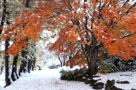 雪化粧してる天狗山の様子が、市内様々なところから見られ、山麓では夏靴で歩けないほどの積雪となり、近くの最上公園では真っ赤なもみじに雪が積もり、辺りはすっかり雪化粧。人の気配もなく静まり返っていた。