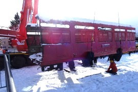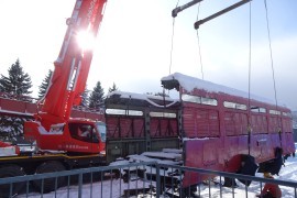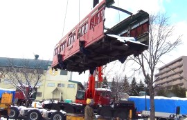 未明から降り続いた雪が積もる中、前頭部(5.5t)・後頭部(5.5t)と内部機器と台車を取り除いた中間部(10t)のうち、中間部を先にクレーンで吊り上げて特殊トレーラーに載せ、200m離れた中央ホームまで移動し吊り上げて線路上に下ろした。
