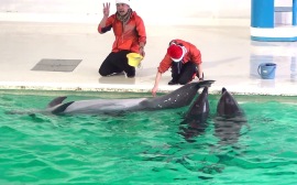クリスマスソングに合わせ、息を揃えたジャンプや素早い泳ぎ、鳴き声が披露され、大きな拍手が送られていた。