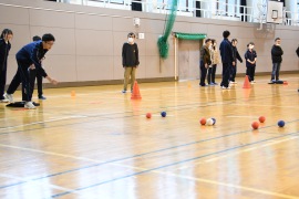 保健体育の時間を利用し、体力や技能の程度・性別・障害の有無等に関わらず、運動やスポーツの多様な楽しみ方を共有できるよう、人と人を繋げるスポーツのボッチャを通じて、同校の近隣にある障がい者施設の利用者と交流を図った。