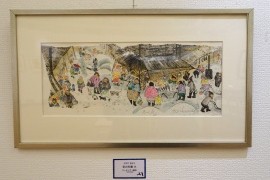 今は無き市内の代表的市場を描いた作品は、当時の暮らしぶりが分かる鮭を捌く様子や妙見市場のカーブした緑色のトタン屋根、市場の冬の景色など、記録として残したいと今後絵本にする一部を展示紹介している。