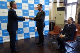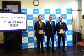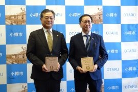小樽市(迫俊哉市長)は、おたるゼロカーボン推進事業者制度の最高評価・三ツ星認定に、北海道ワイン株式会社(朝里川温泉1・嶌村公宏代表取締役社長)と株式会社北洋銀行小樽中央支店(稲穂2・高原竜治支店長)を認定し、12月19日(金)10:00から市役所(花園2)2階市長応接室で認定式を実施した。