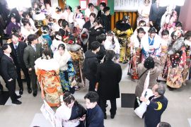 悪天候が予報されていたが、午前中は比較的穏やかに経過したが、午後には予報通りの風と雪が強く降る生憎の空模様の中、華やかな振袖やスーツで決めた二十歳の参加者が会場に続々と集まり、懐かしい友人との再会を喜んでいた。