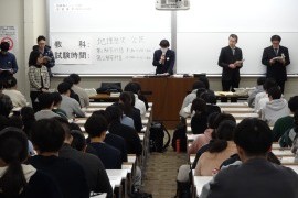 試験教室は5室設けられ、報道関係へ写真撮影が許可された第1試験室(104講義室)では、約100人の受験生が入室し、張り詰めた雰囲気が漂う中、担当係員より注意事項が述べられ、携帯やアイパットなどの電子機器を机の上に出し、電源をOFFにしてから再びカバンにしまうよう伝え、不正行為について注意を促した。